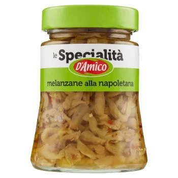 Melanzane 58%, Olio di semi di girasole, Aceto di vino, Peperoni, Olio extra vergine di oliva, Sale, Piante aromatiche, Spezie, Correttori di acidità acido citrico, Antiossidanti acido ascorbico
