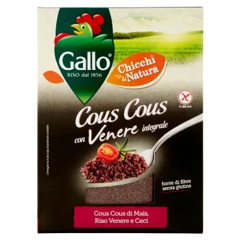 Il Cous Cous, piatto originario del Nord Africa, incontra il Riso Venere italiano, un riso integrale dall’inconfondibile colore nero e dal caratteristico aroma di pane appena cotto, donandogli un sapore e una colorazione unici nel suo genere. L’aggiunta di farine di Mais e Ceci lo rende un alimento gustoso e completo. È fonte di magnesio e fosforo, sostanze che contribuiscono al normale metabolismo energetico. Specificatamente formulato per persone intolleranti al glutine.